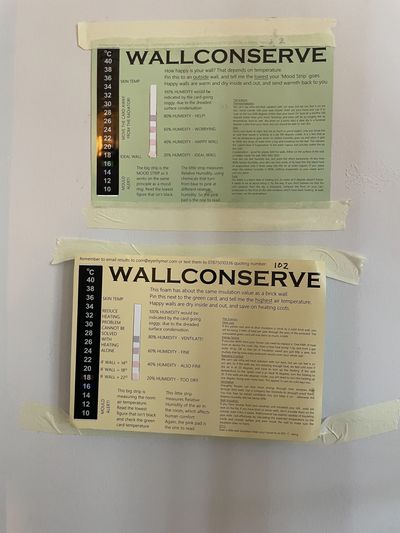 These postcards each have a humidity and temperature test strip, can tell you a lot, and us a lot more. Click on the image, fill out the form and we will send them to you, free of charge. Then send us a photo taken on a coldish morning, and we will tell you if your wall is happy (most walls are) or if it we can make it happier.